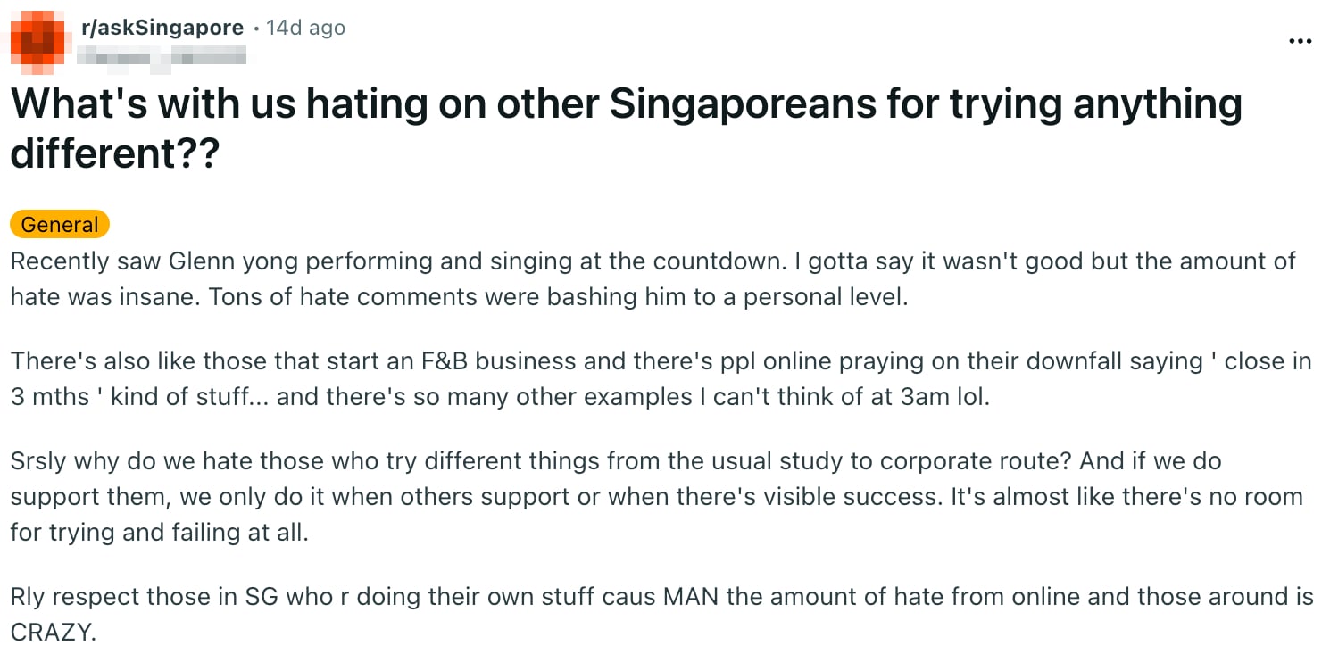 In early January, a Reddit user posted a long message questioning why Singaporeans seem so quick to tear down their own people when they try something different.