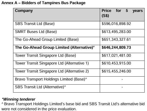 Go-Ahead awarded Tampines bus package after tender last Dec