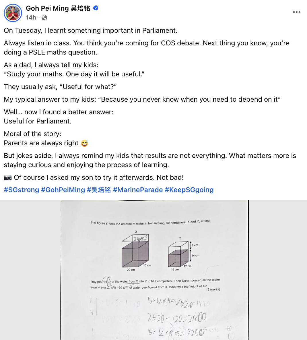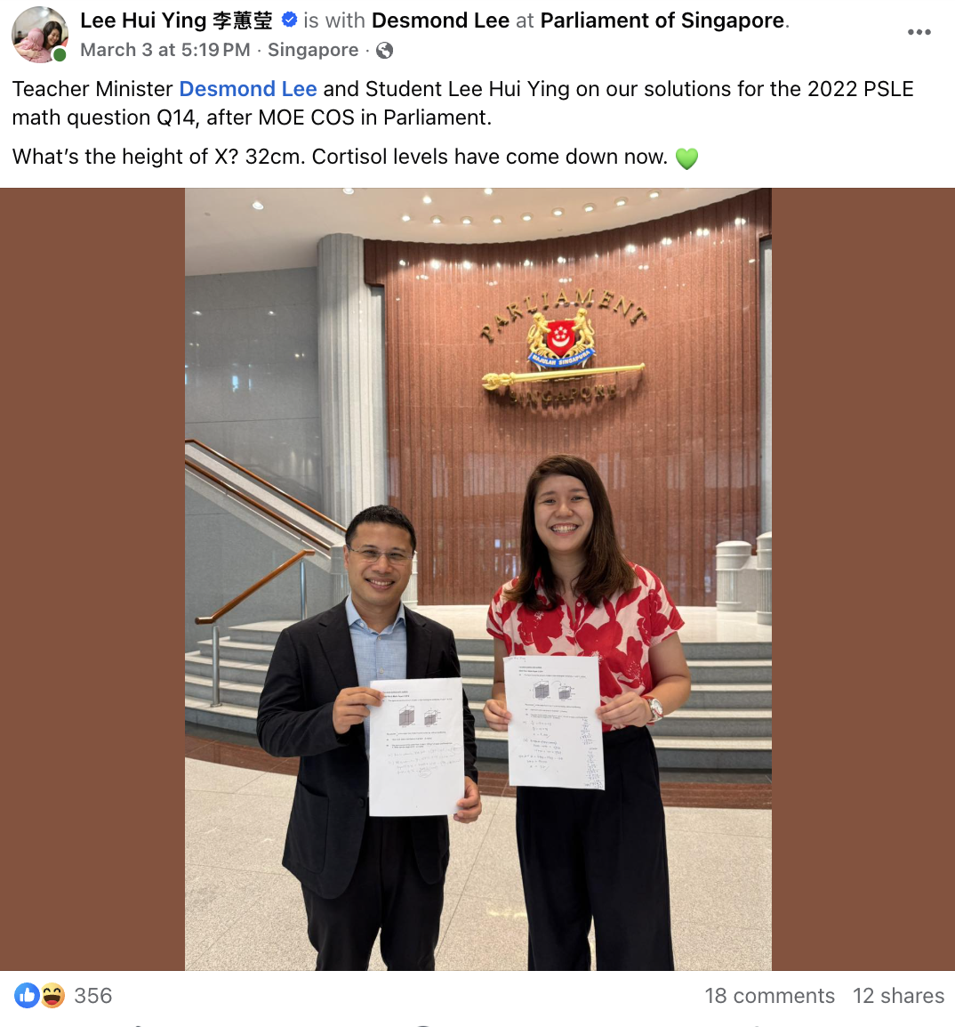 “Teacher Minister Desmond Lee and Student Lee Hui Ying on our solutions for the 2022 PSLE math question Q14, after MOE COS in Parliament,” she wrote.