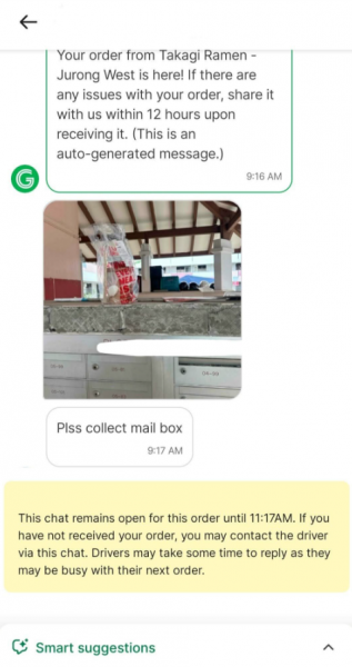 Customer expresses frustration over Grab delivery rider’s decision to leave food order on HDB mailbox