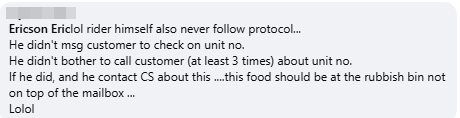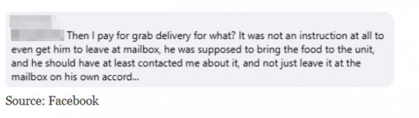 “Hence, I would expect the food to be delivered straight to my unit instead, and not to be left on the mailbox on the rider’s own accord, where I have to go downstairs personally and take the food myself.”