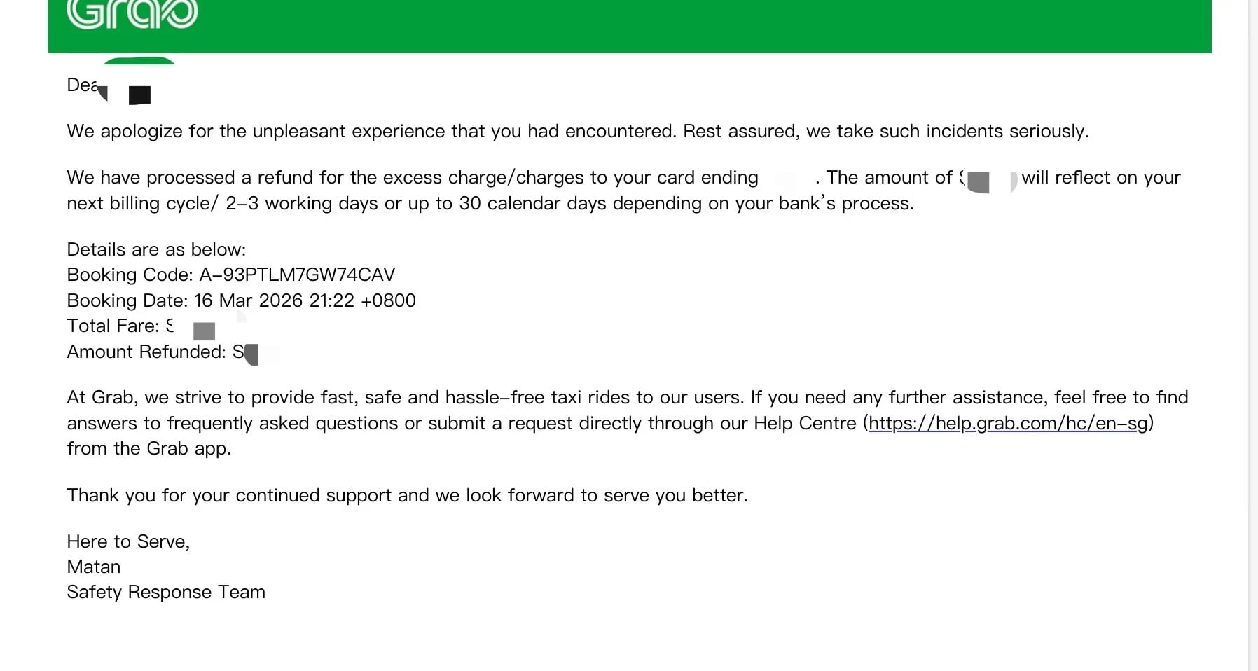 The next day, she received an email from Grab, apologising for the incident and refunding her for the trip.