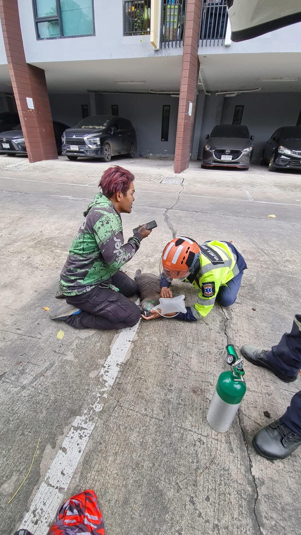 Grab rider in Thailand frantically tries to revive cat after saving it from burning building
