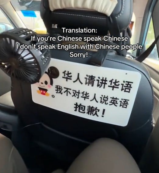 The driver will not speak English with Chinese passengers, according to the sign seen in a TikTok video posted on 7 April.