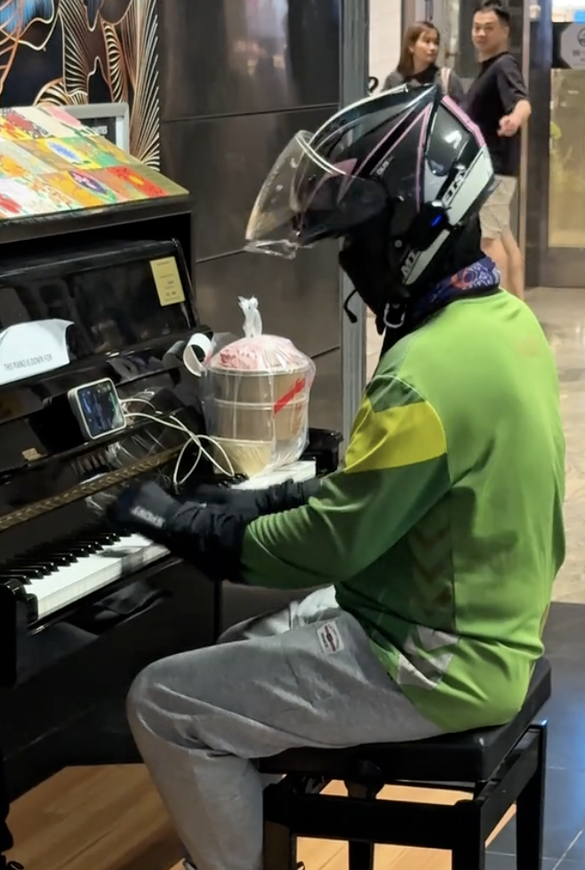 The rider was seen with three bowls placed at the side of the public piano, which suggests he was in the middle of a delivery job.