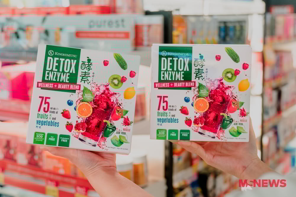 Kinohimitsu’s Detox Enzyme Sachets for Digestive Health are formulated with extracts from 75 fruits and vegetables to support digestion, help the body eliminate toxins, and restore digestive balance, with fast-acting relief typically felt within two to four hours.