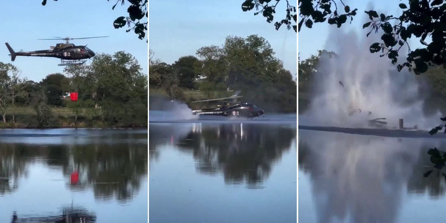 In the viral clip, the helicopter can be seen swooping low over a lake to refill its water bucket. Instead of slowing down as the bucket dipped into the water, the aircraft continued its descent.