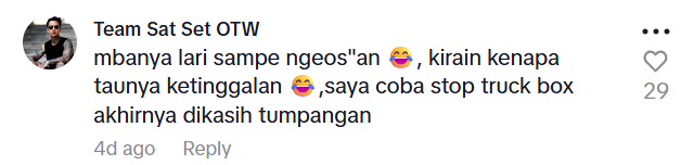Translation: The lady ran until she was out of breath 😂, I thought why, but she was left behind 😂, I tried to stop a box truck and finally she gave me a lift