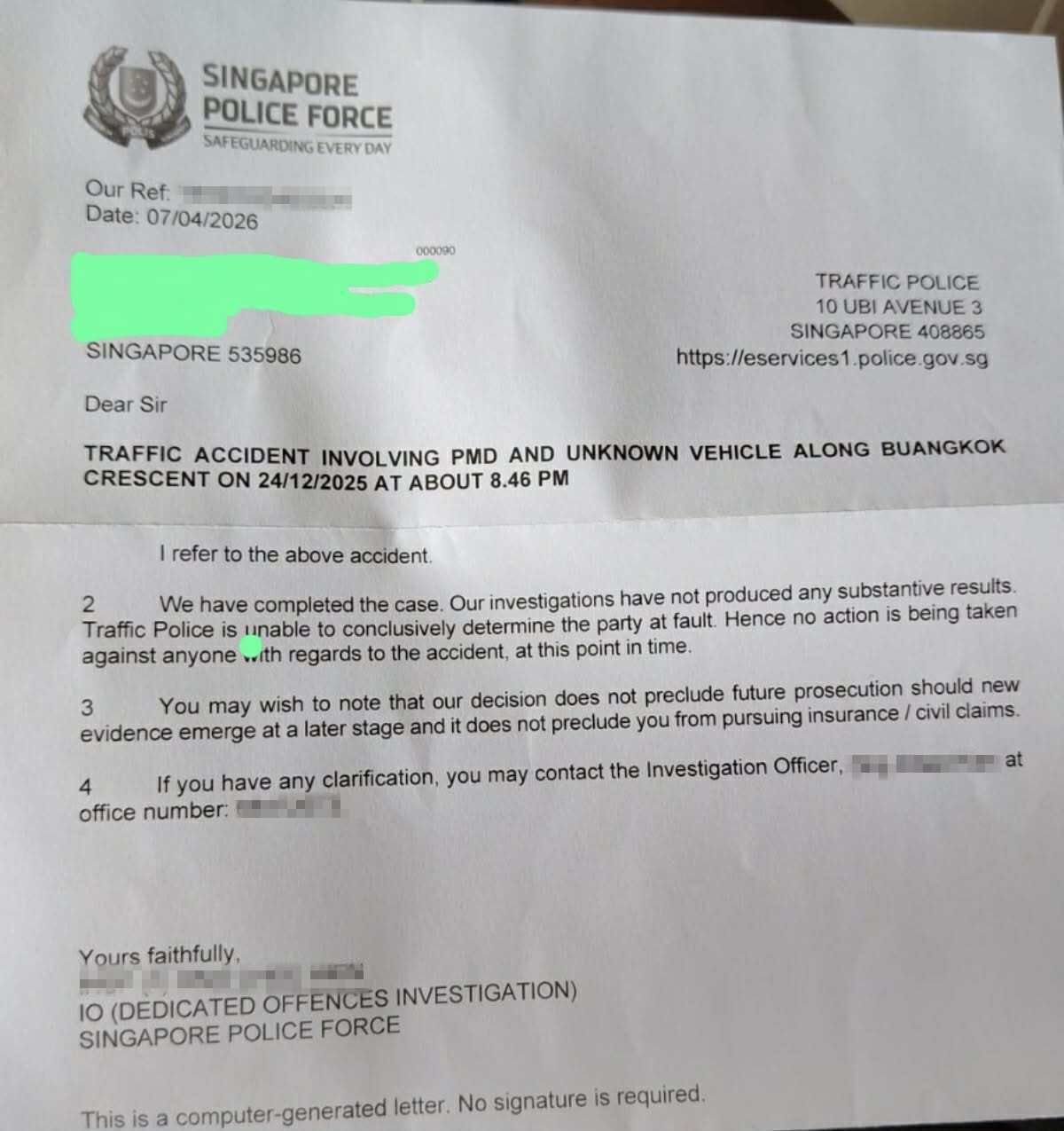 According to Mr Kartikesan, the case was investigated by the Singapore Traffic Police (TP) as a suspected hit-and-run, but was later closed after investigations did not “produce any substantive results”, based on a TP letter.