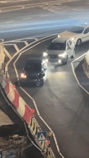 As it drove off, the car moved unsteadily, emitting smoke and crashing into the barricades at one point.