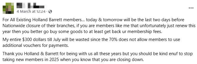 He warned other members that Holland & Barrett was closing down nationwide in the next few days, and advised them to buy some goods to get back their fees.