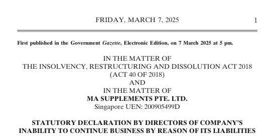 However, on 7 March the directors of MA Supplements made a statutory declaration in the Government Gazette, saying they could not continue the business due to its liabilities.