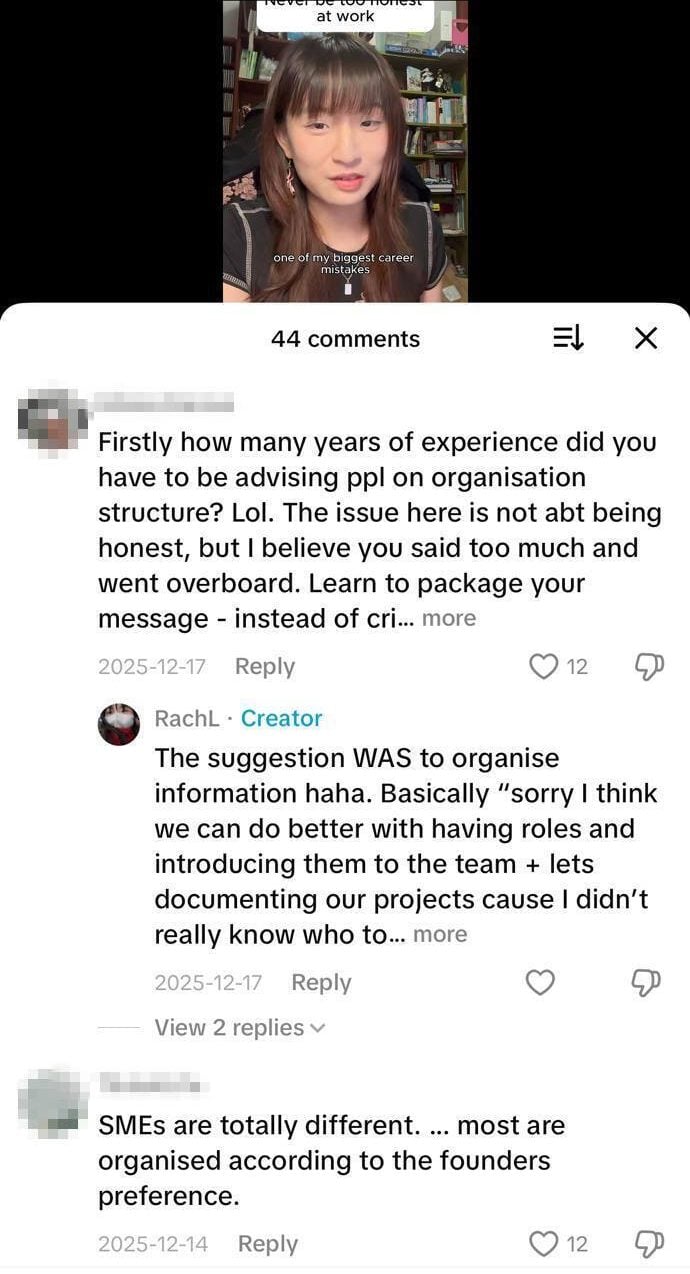 A Singapore TikTok user has gone viral after sharing how being “too honest” in the workplace became one of her biggest career regrets.