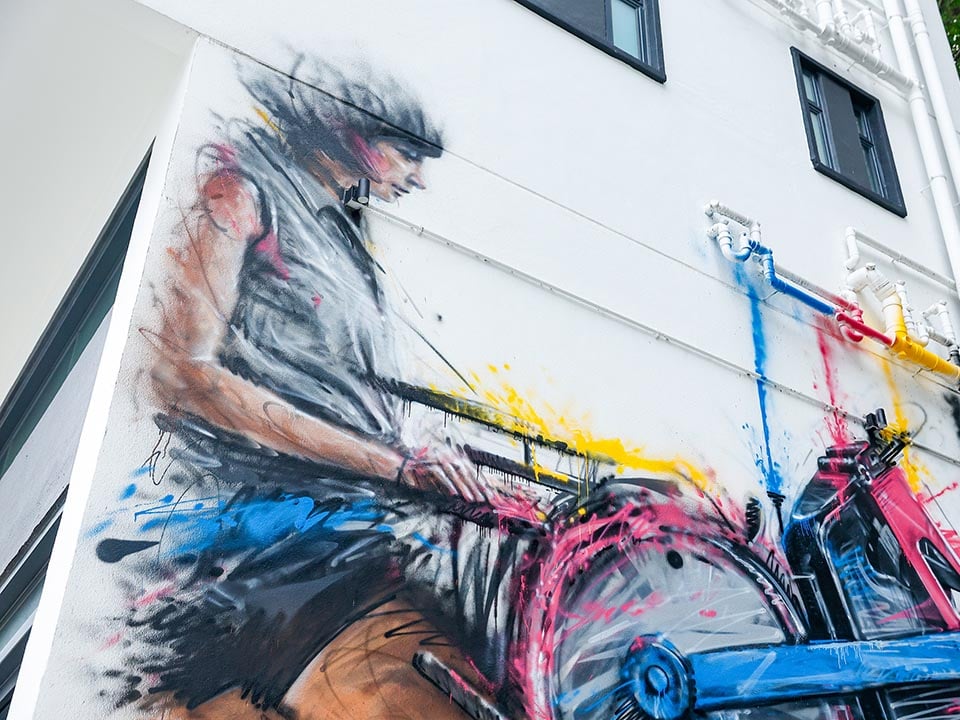 Another standout mural by local graffiti artist Alex Croft has become one of Hong Kong’s most Instagrammed pieces of street art. Featured in travel guides, it reimagines the signature ‘Yaumati’ print from G.O.D., inspired by the former Kowloon Walled City.