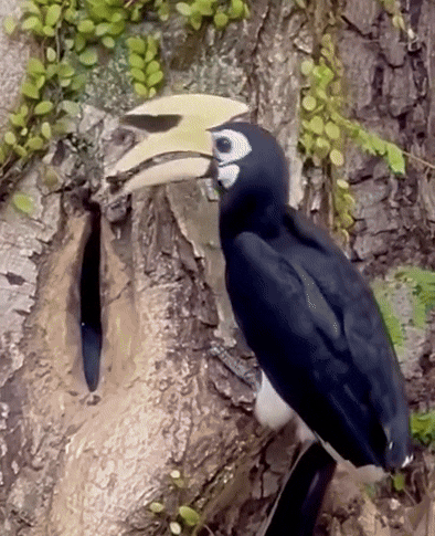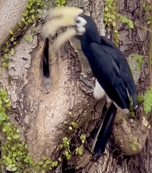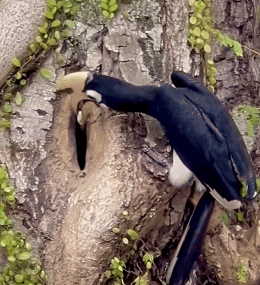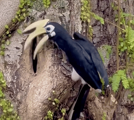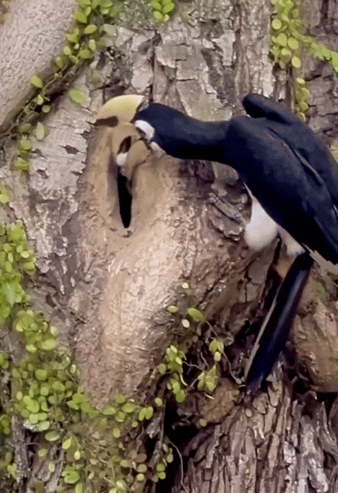 In the footage, the adult oriental pied hornbill — likely a male due to the size of its bill — had brought home a bird egg for its eager kids.