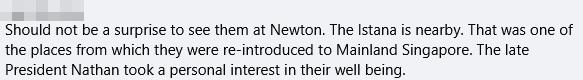 One user did not find the presence of hornbills at Newton Food Centre a surprise due to its close proximity to the Istana.