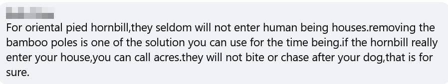 Some suggested removing the bamboo poles outside his window to prevent the bird from perching there, while advising him to contact wildlife rescue group ACRES if the hornbill were to enter his home.