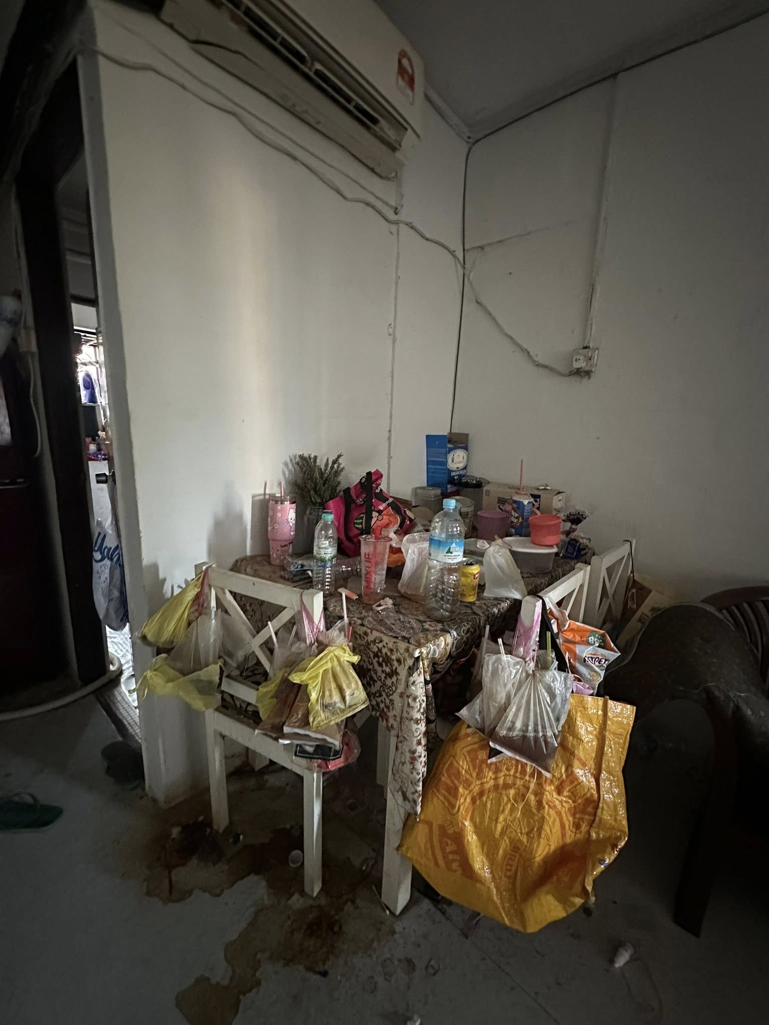 Photos shared online showed the home strewn with rubbish, including piles of used baby diapers, scattered cigarette butts, and unfinished bagged drinks left hanging on dining chairs.