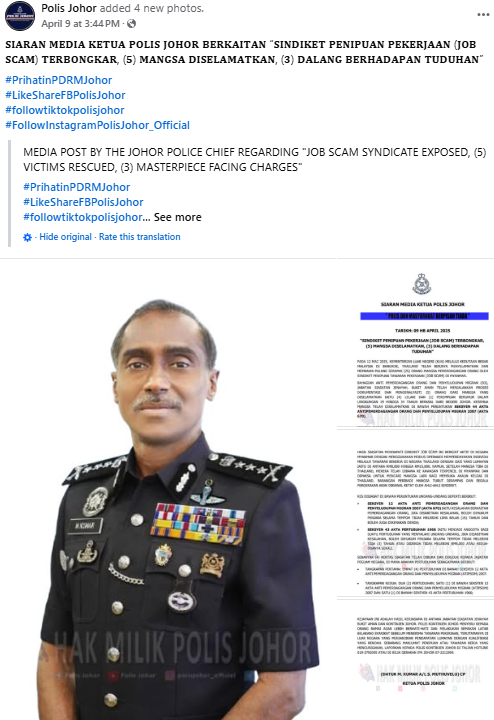 Johor Police Chief Commissioner M. Kumar confirmed the arrests in a Facebook post on Wednesday (9 Apr).
