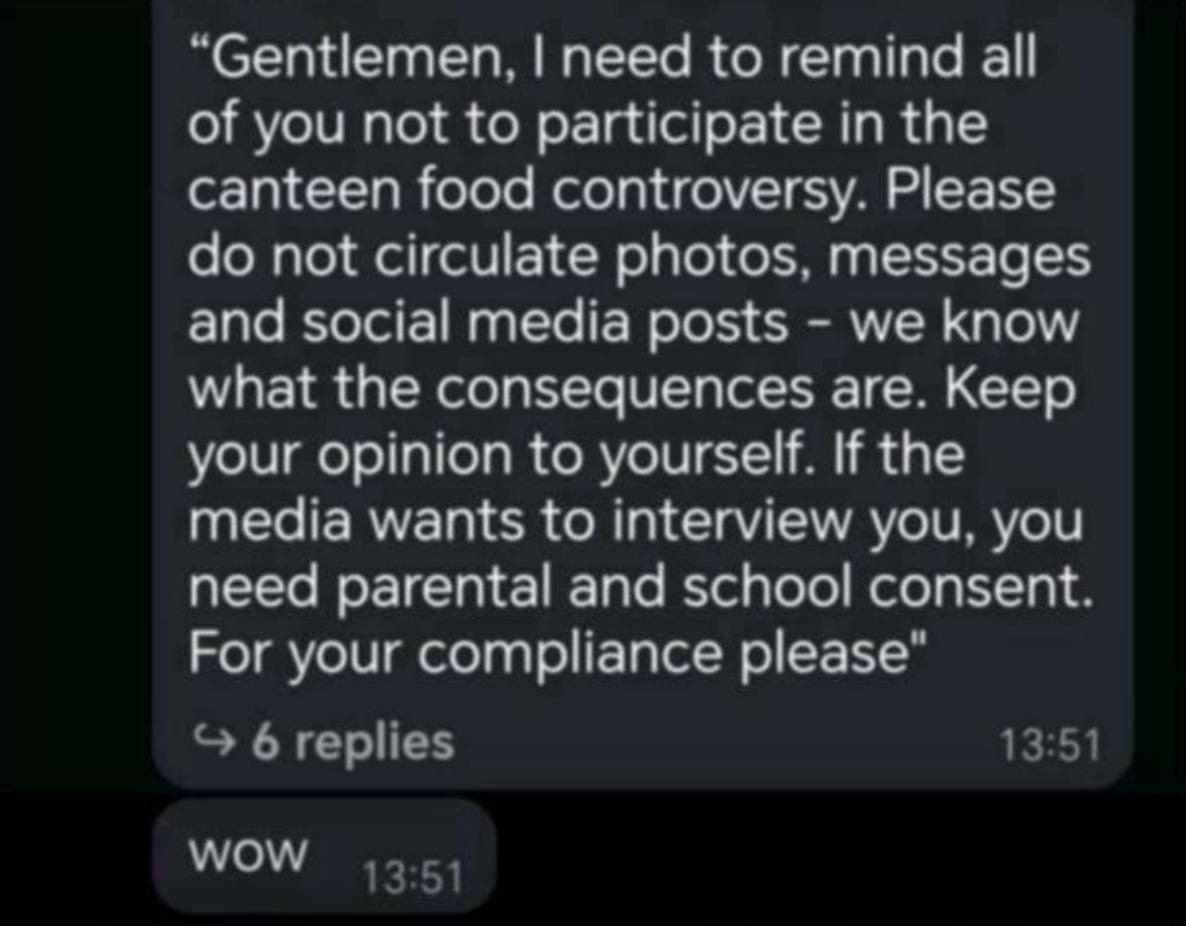 The message reportedly reminded students not to take part in discussions surrounding the “canteen food controversy” and cautioned them against sharing photos, messages, or social media posts related to the issue.