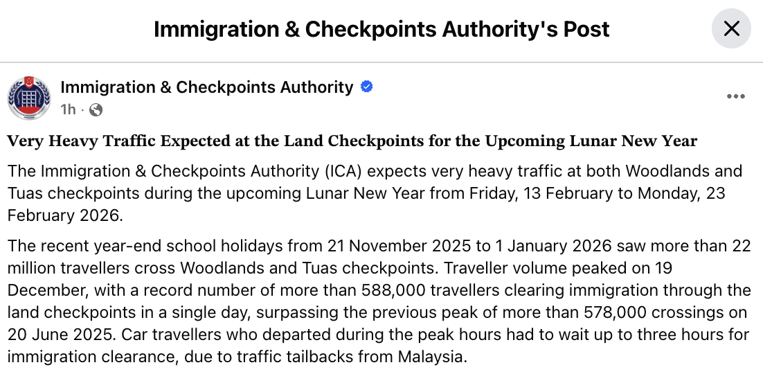 The Immigration & Checkpoints Authority (ICA) has warned that “very heavy traffic” is expected at Woodlands and Tuas checkpoints during the upcoming Lunar New Year period, from 13 Feb to 23 Feb 2026.