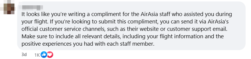 One Facebook user suggested Ms Jacyntha submit her compliment through AirAsia’s official customer service channels, including its website and email, so that the airline would acknowledge its staff’s supportive actions.