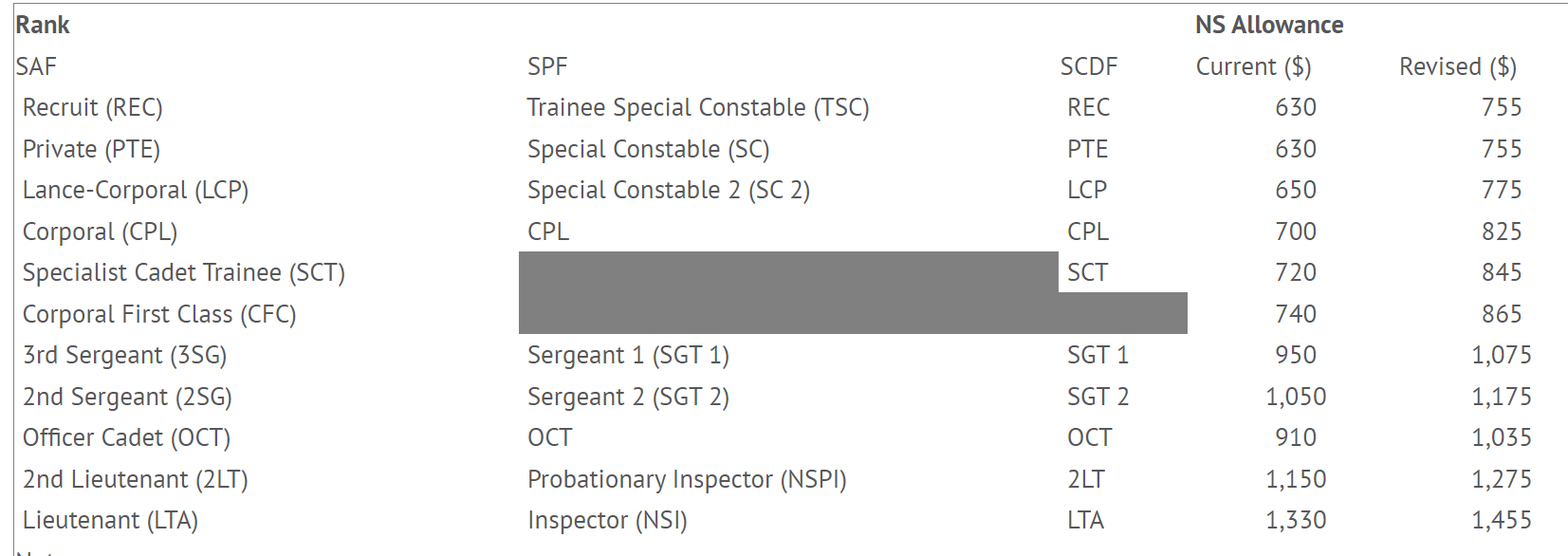 For instance, NSFs holding the rank of Recruit as well as trainees will receive a revised starting allowance of S$715, a 5% increase from S$680.