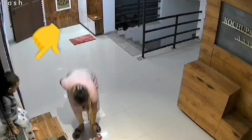 Anvika was seen slipping into adult-sized footwear, while her mother stood by, locking the door.