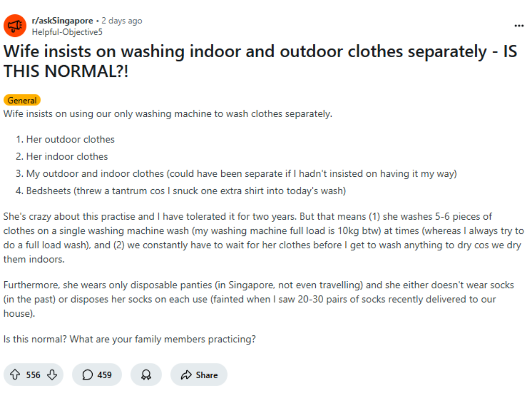 In a post shared on the subreddit r/askSingapore on 7 July, the Original Poster (OP) questioned if this habit was normal, stating that his wife takes laundry hygiene to an extreme level.