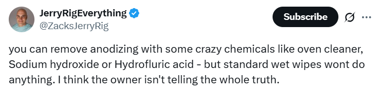 JerryRigEverything, a popular phone tester persona online, also weighed in on the post and explained that the phone’s paint would only come off using a strong cleaner, not standard wet wipes.