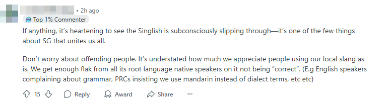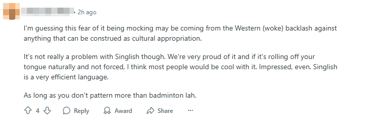Many Singaporean Redditors quickly reassured him that using Singlish is not only acceptable, but often welcomed, so long as it’s done sincerely and respectfully.