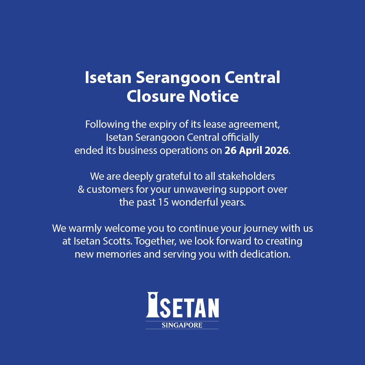 After 15 years of operations, Isetan closed its outlet at NEX mall in Serangoon on Sunday (26 April).