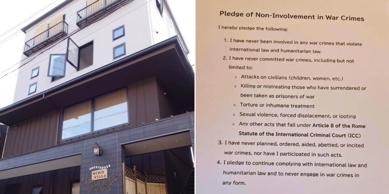 An Israeli tourist checking into a guesthouse in Kyoto, Japan was taken aback when he was asked to sign a form declaring he had not committed any war crimes.