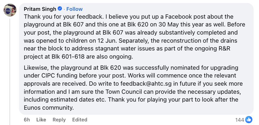 “Do write to feedback@ahtc.sg in future if you seek more information,” he said. “I am sure the Town Council can provide the necessary updates.”