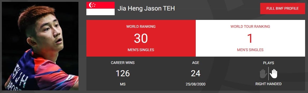 He is now the second-highest-ranked men’s singles player in Singapore, with Loh Kean Yew ranked No. 11.