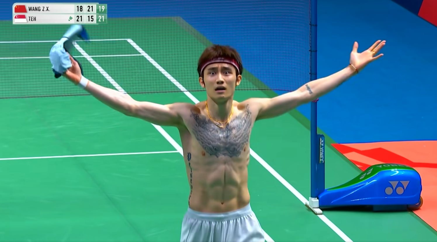 The Singaporean eventually triumphed 21-18, 15-21, 21-19 over three games, ecstatically whipping off his shirt to reveal his chest tattoo that sported the words “Be Fearless Be Brave”.
