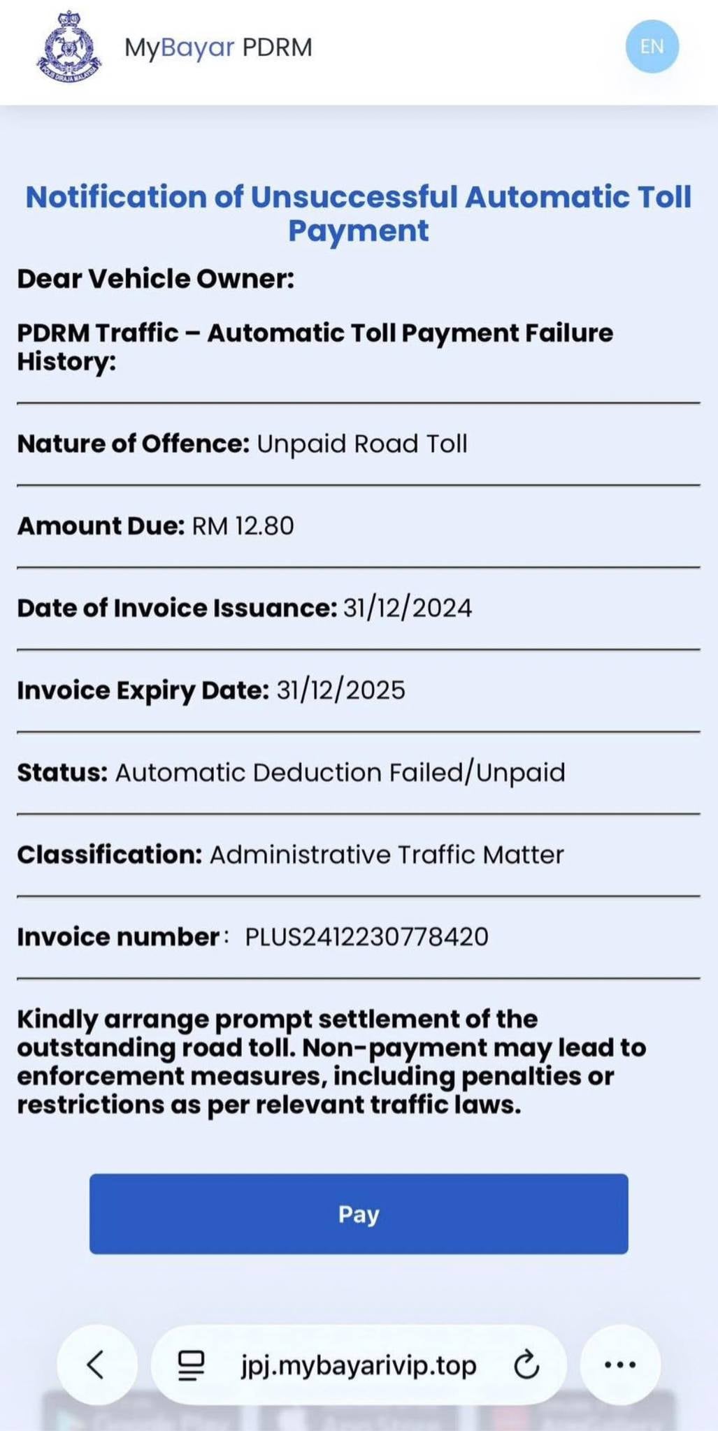 The page, branded as “MyBayar PDRM”, stated that the user had an “Unsuccessful Automatic Toll Payment”.