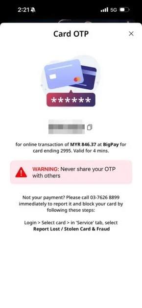 Additionally, a One-Time Password (OTP) notification confirmed an unauthorised transaction of RM 846.37 (S$270) via BigPay, prompting the victim to immediately report the fraudulent activity.