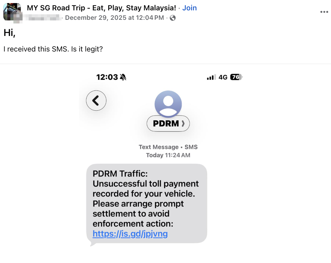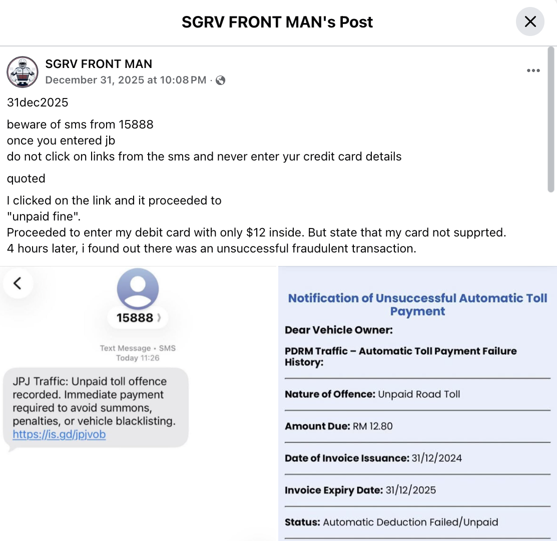 A warning about a suspected scam SMS has been circulating after a post was shared in the SGRV FRONT MAN’s Facebook group on Wednesday (31 Dec 2025), cautioning motorists who have just entered Johor Bahru (JB), Malaysia.