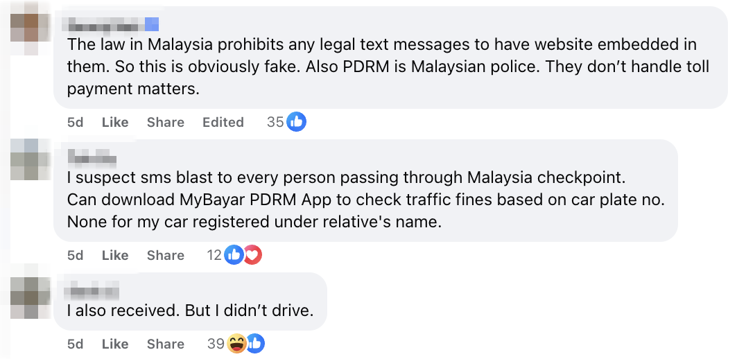 Online comments have flooded with warnings about the scam, with some users mentioning that the Malaysian authorities never include links in their SMS messages.