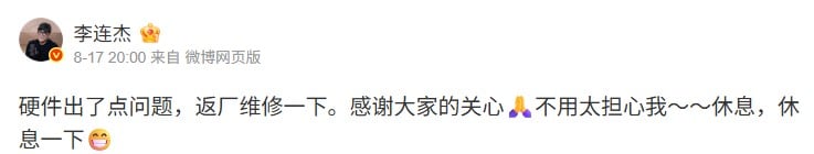 In a Weibo post on the same day, Li shared that his “hardware” had broken down.