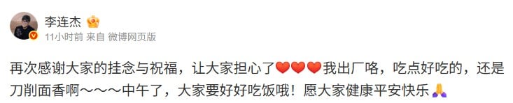 He thanked fans again for their concern and well-wishes, informing them that he had left the “factory” and had eaten delicious knife-cut noodles.