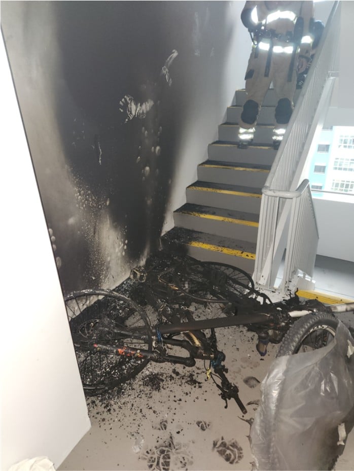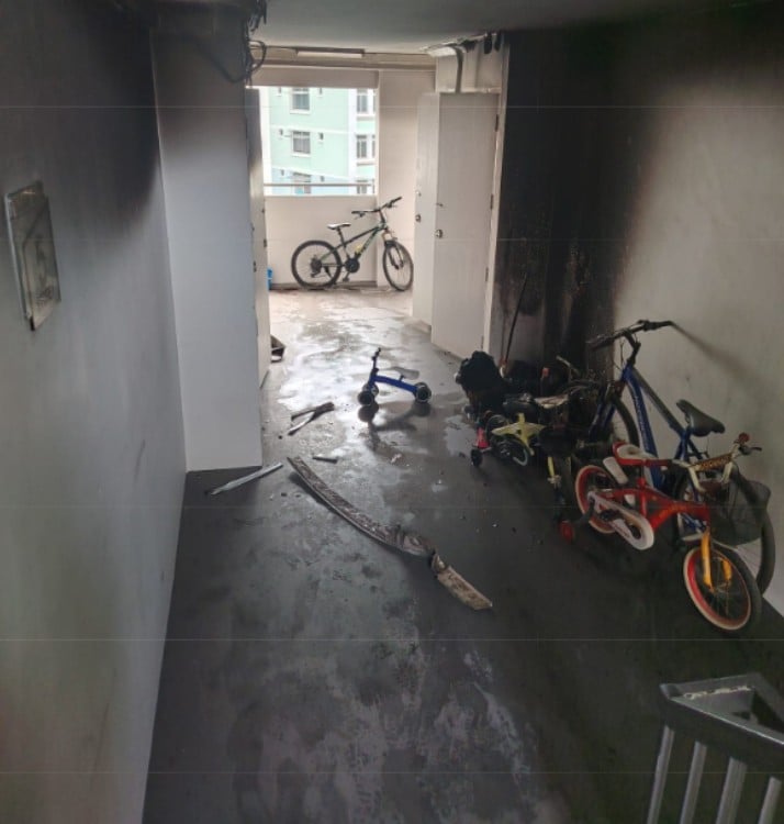 The fire caused property damage, including scorched walls and two burnt bicycles. No injuries were reported.