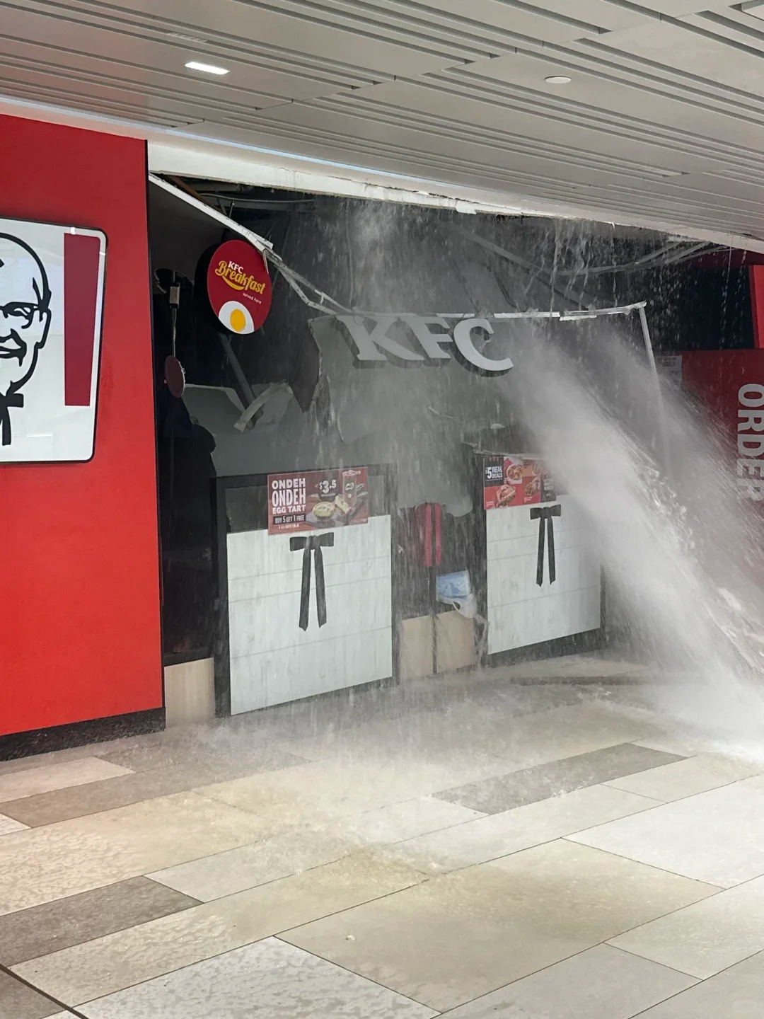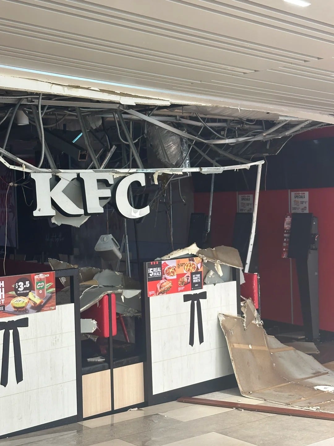 Another photo showed that ceiling panels had fallen onto the tables and floor, with wires sticking out of the ceiling and the KFC sign dislodged.
