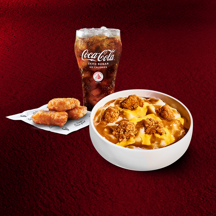 For ultimate comfort food, the Famous Bowl Meal combines mashed potatoes, gravy, corn, and crispy chicken in one hearty bowl.
