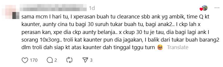 Translation: Just like me the other day, I didn’t notice the fruit was on clearance because the child took it, when I was at the counter, the Chinese aunty gave me 30 minutes and asked me to change the fruit, for the children.. I said you didn’t notice right, it’s okay he said aunty’s treating you.. 30 is not enough you know, he gave my child 10x3org.. He also takes care of the trolley at the counter, I came back from changing fruits and the stuff in the trolley are already done on the counter and now waiting for my turn Â