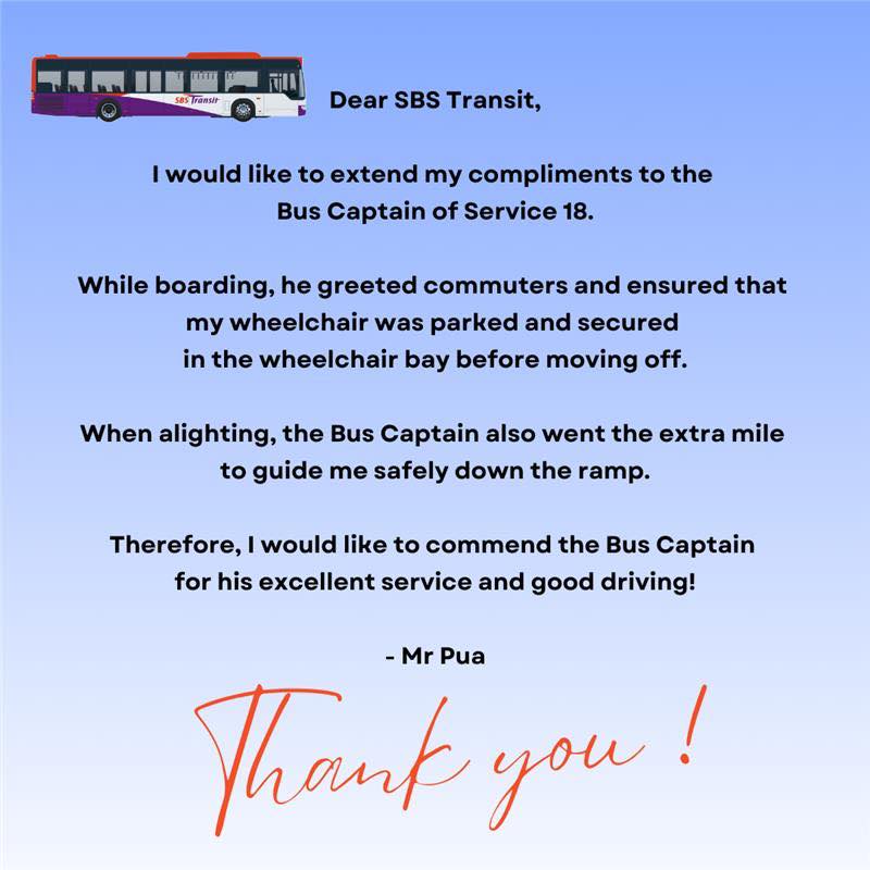 “Thank you for your outstanding service!” said Mr Pua, who shared his gratitude with SBS Transit.