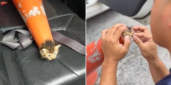 Tiny kitten in M’sia gets head stuck in tip of traffic cone, netizens wonder how it got there