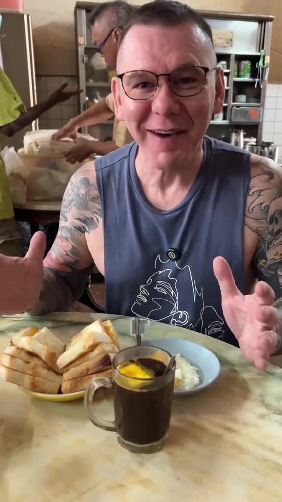 Viewers were then treated to his thoughts on the kaya butter toast. “Nice, thick bread, a lovely, big, juicy slab of butter on there,” he said.