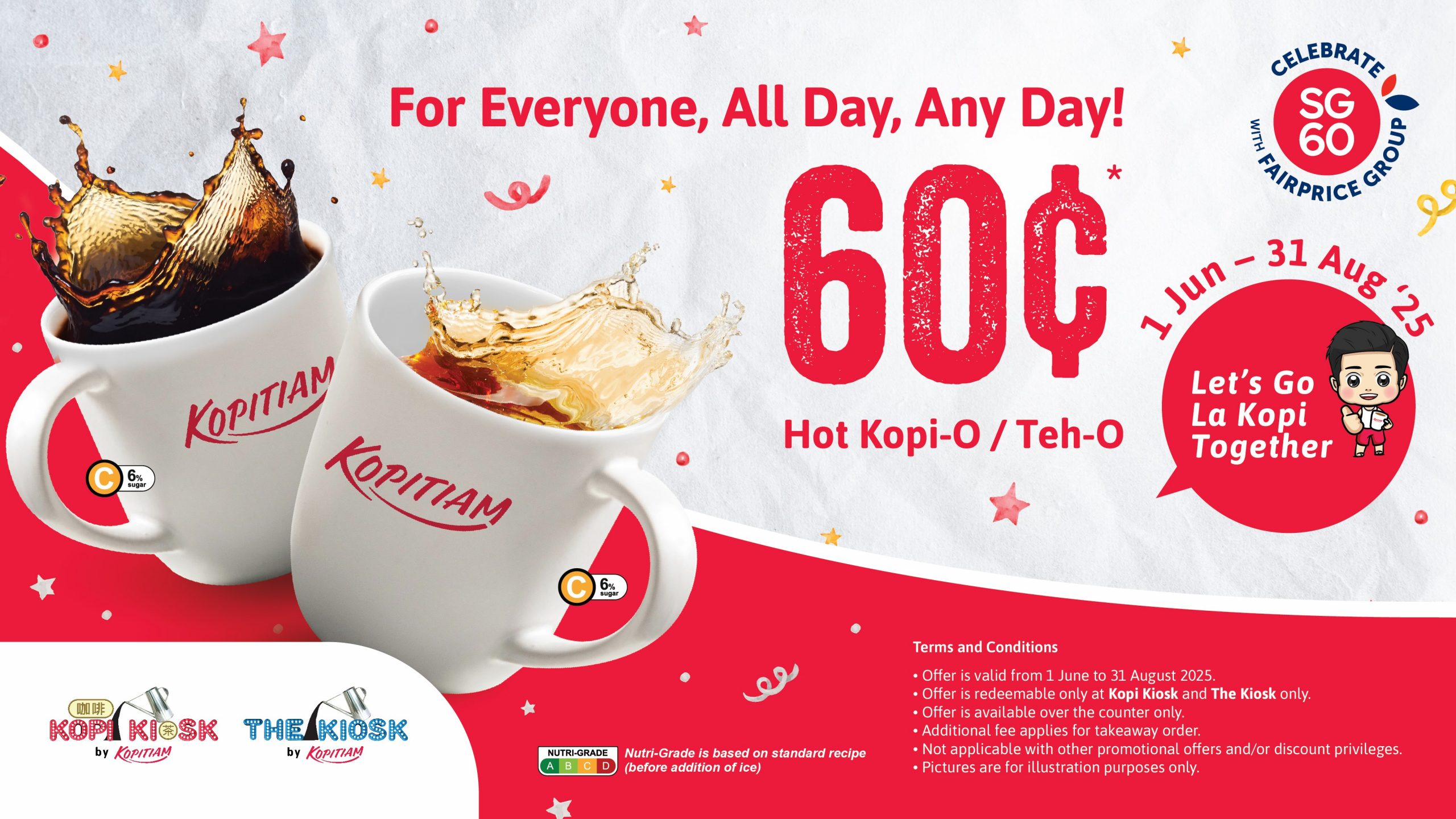 Those in Singapore can soon enjoy S$0.60 hot Kopi-O and Teh-O at all 79 Kopitiam outlets as FairPrice Group celebrates SG60.